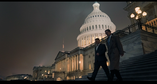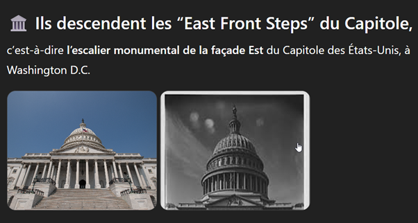Les deux personnes descendent les marches situées du côté Est ou Sud-Est du bâtiment, une zone souvent utilisée pour les scènes de films, séries ou reportages politiques.