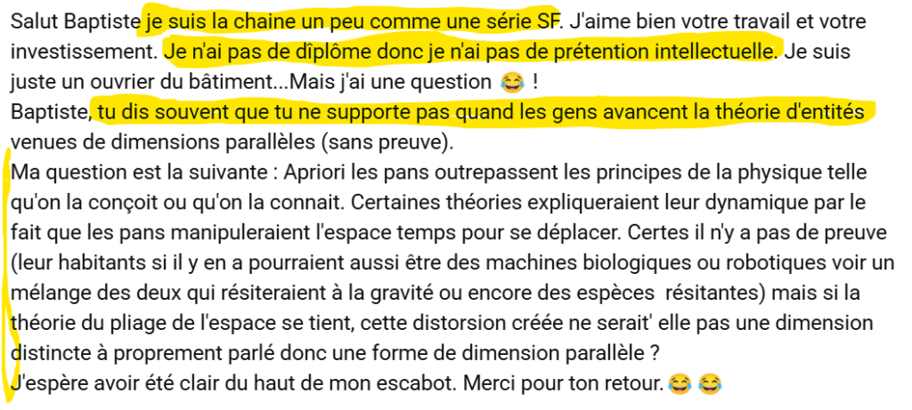 On garde le meilleur pour la fin. Il a raison: On peut poser des questions à tout âge, et à n’importe quelle moment de son développement. Je le dis toujours: Ce qui est important, cela n’est pas où on est arrivé, mais son point de départ. Par contre répondre à sa question, cela va être difficile, sauf peut être pour Baptiste. Enfin nous on est pas arrivé ;>(