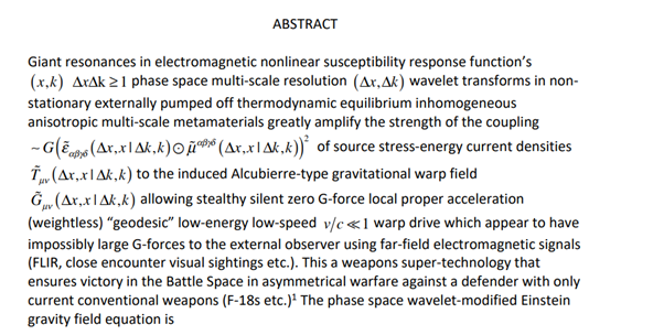 Son document ambitieux se nomme « How Flying Saucers/Tic Tacs Really Work ». L’introduction va tout de suite dans le vif du sujet, et 99.999 % des personnes s’arrêtent au titre.