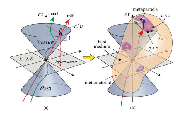 L’image (a) montre un objet subissant les limites de l’espace-temps. L’image (b) montre un objet qui crée son propre espace-temps grâce à sa coque en métamatériau, lui permettant de s’affranchir des limites de vitesse et d’accélération observées par nous.