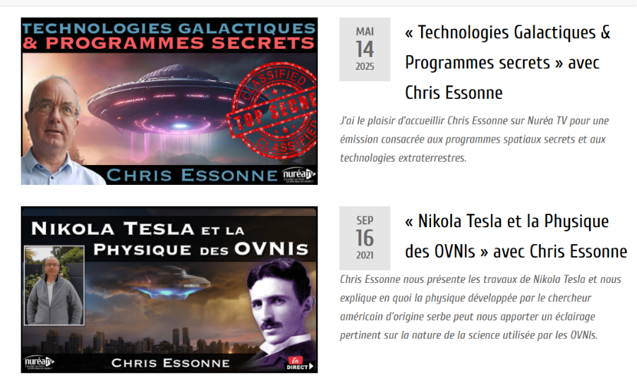 Une recherche sur Google m’a permis de mieux connaitre ses qualités : Chris Essonne, ingénieur et chercheur indépendant, explore l’hypothèse d’une guerre galactique en cours, impliquant des civilisations extraterrestres et des programmes spatiaux secrets.