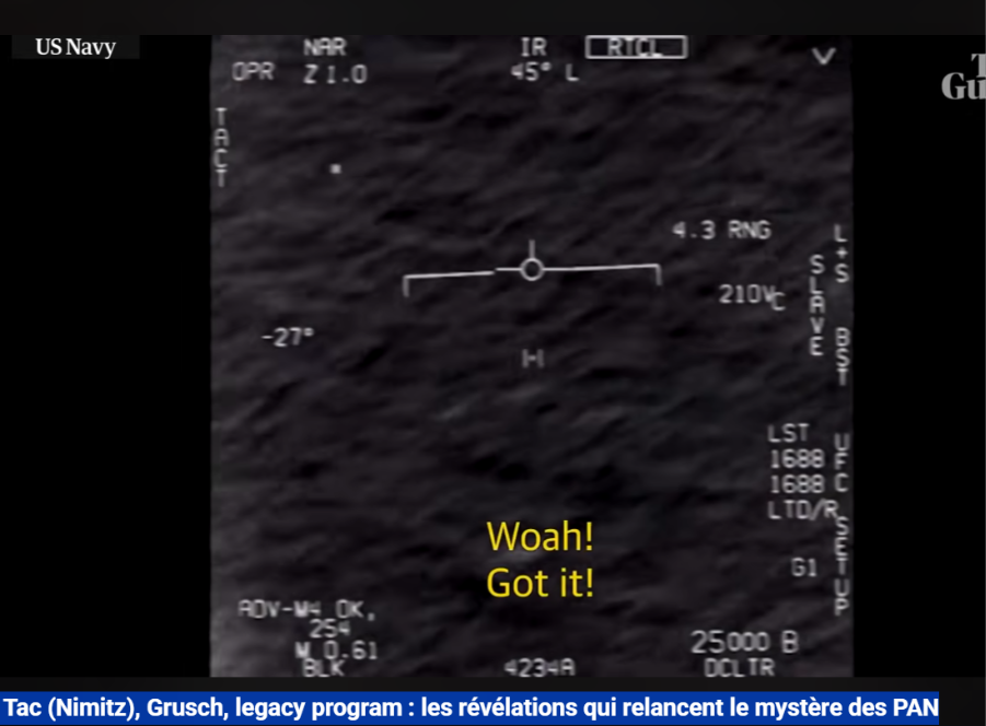 Je l’ai bien étudié, mais hélas je n’ai vu aucun événement permettant une analyse technique de quoi que ce soit. Il n’y a que des déclarations concurrentes, une vidéo pourrie, et ce n’est même pas la bonne qu’ils montrent à l’écran, là c’est GO FAST (Un objet se déplaçant très lentement, authentifié par l’AARO, sans doute un ballon…).